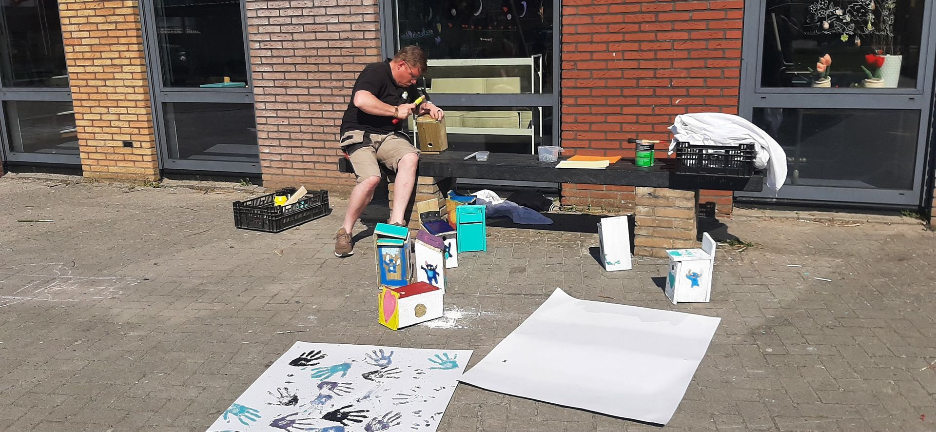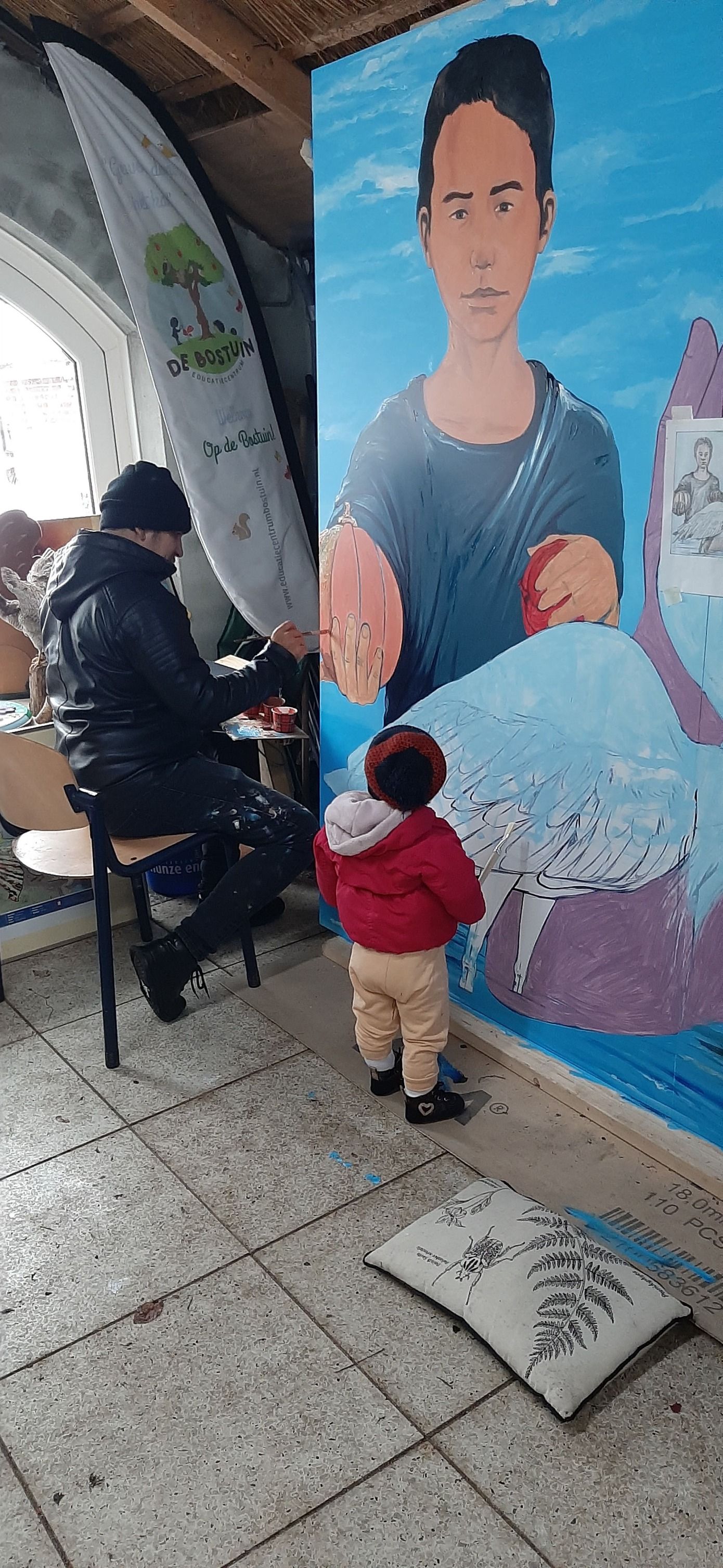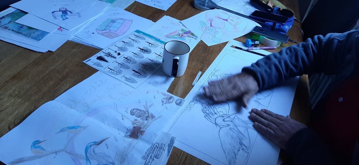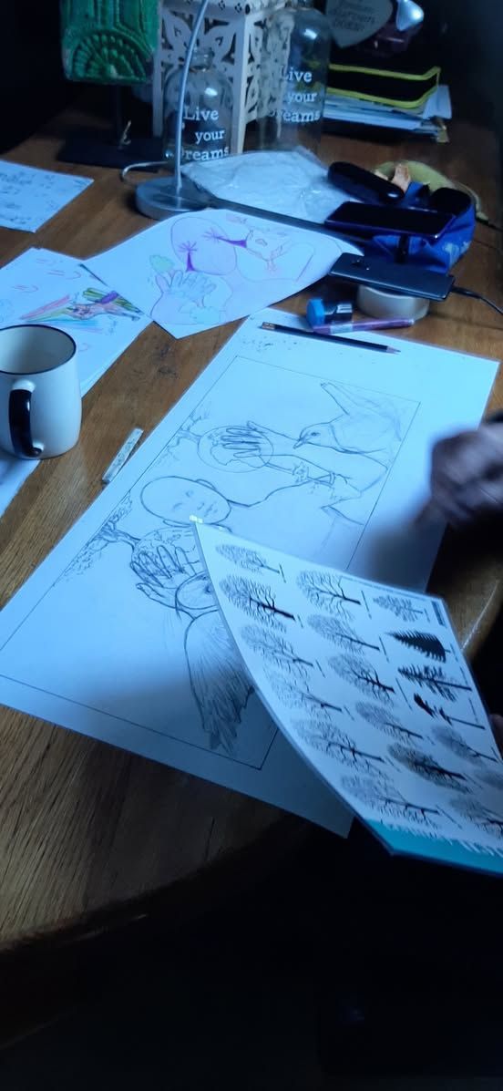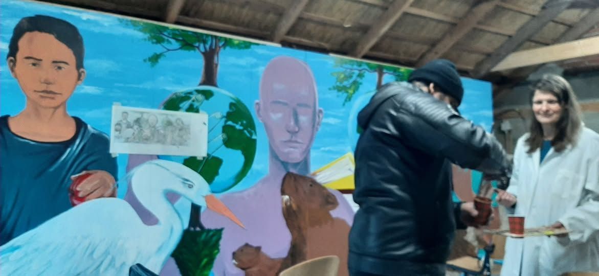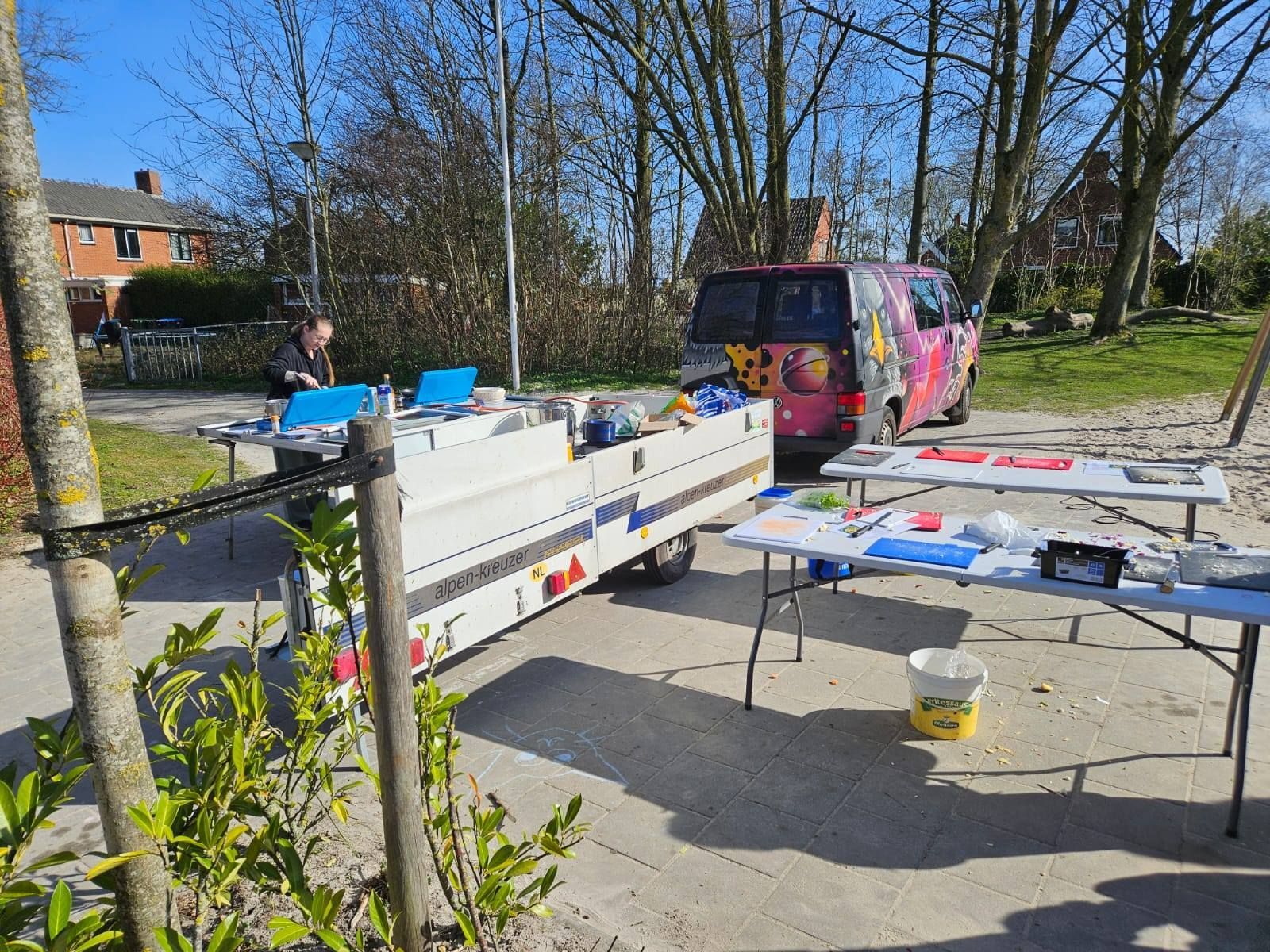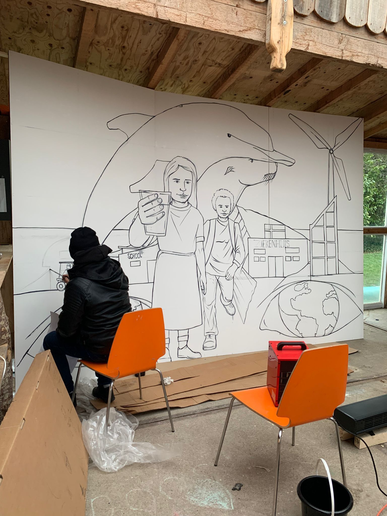 Werkwijze Manuel hij bekijkt alle schetsen welke thema's komen vaak terug wat zijn sterke beelden. Daarmee maakt hij een gezamenlijk kunstwerk. De schets is nu af en morgen plaatst hij het op de panelen. Wij hebben ook een zonnige klusdag gehad.