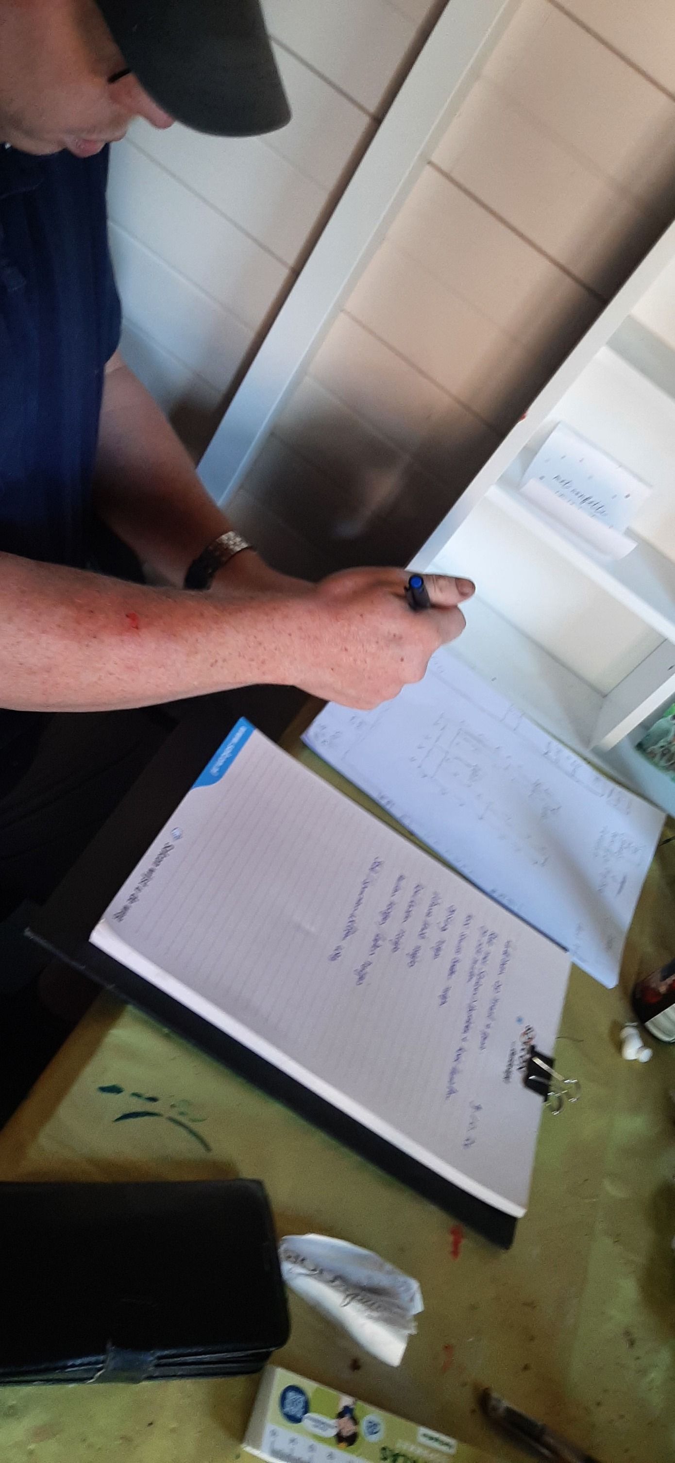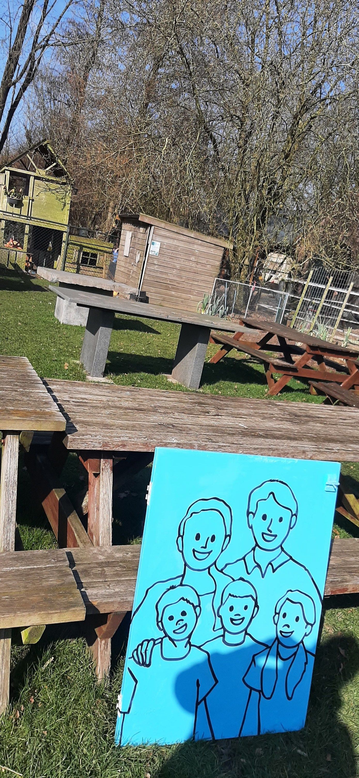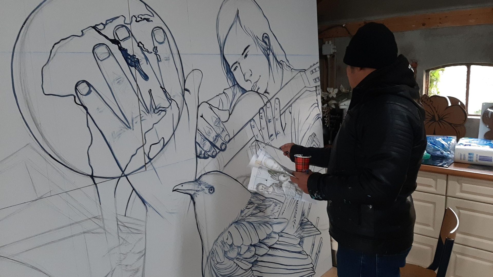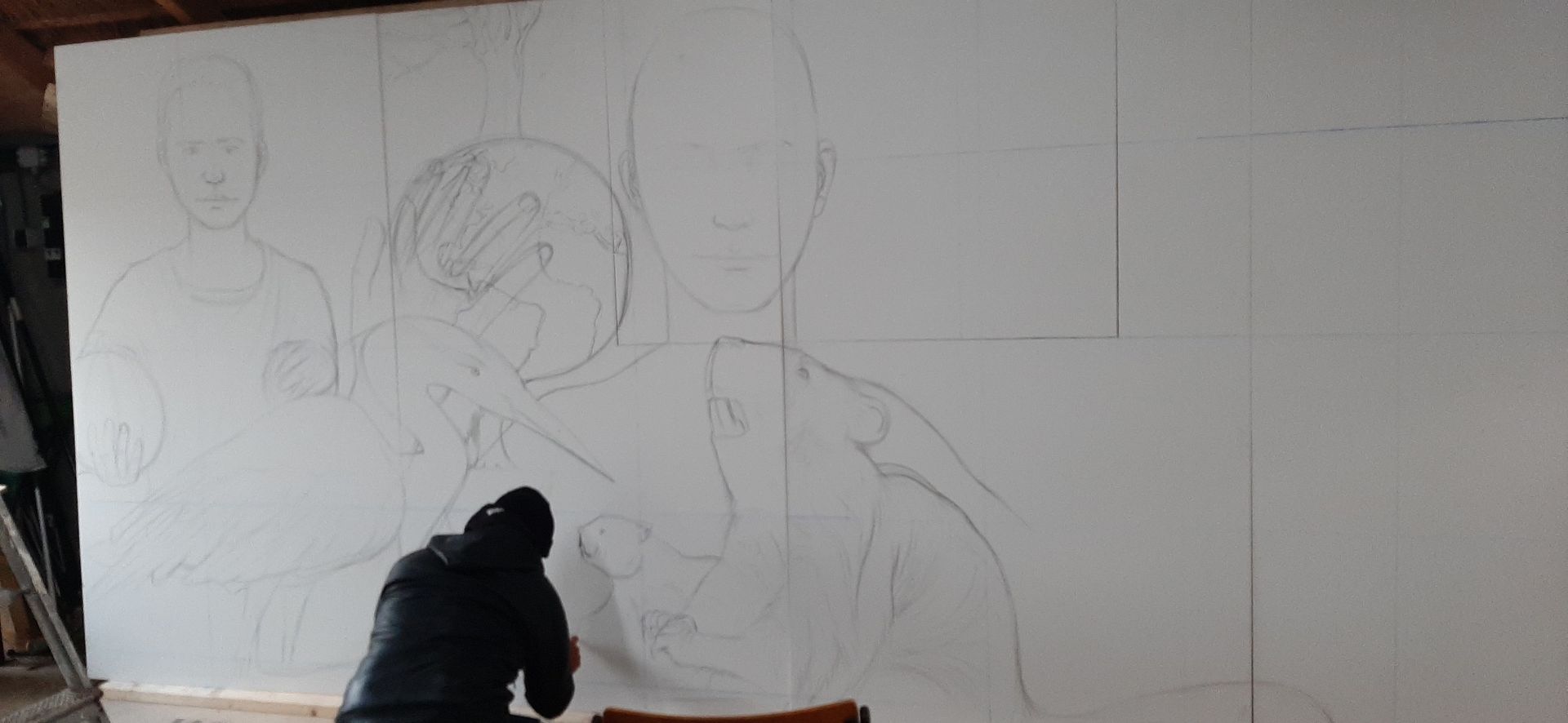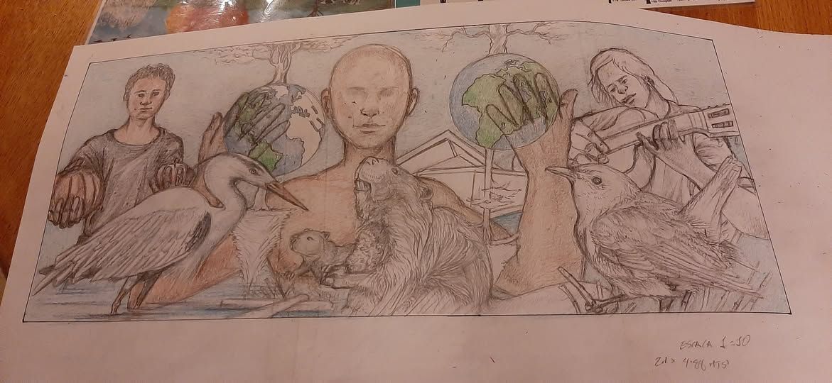Werkwijze Manuel hij bekijkt alle schetsen welke thema's komen vaak terug wat zijn sterke beelden. Daarmee maakt hij een gezamenlijk kunstwerk. De schets is nu af en morgen plaatst hij het op de panelen. Wij hebben ook een zonnige klusdag gehad.