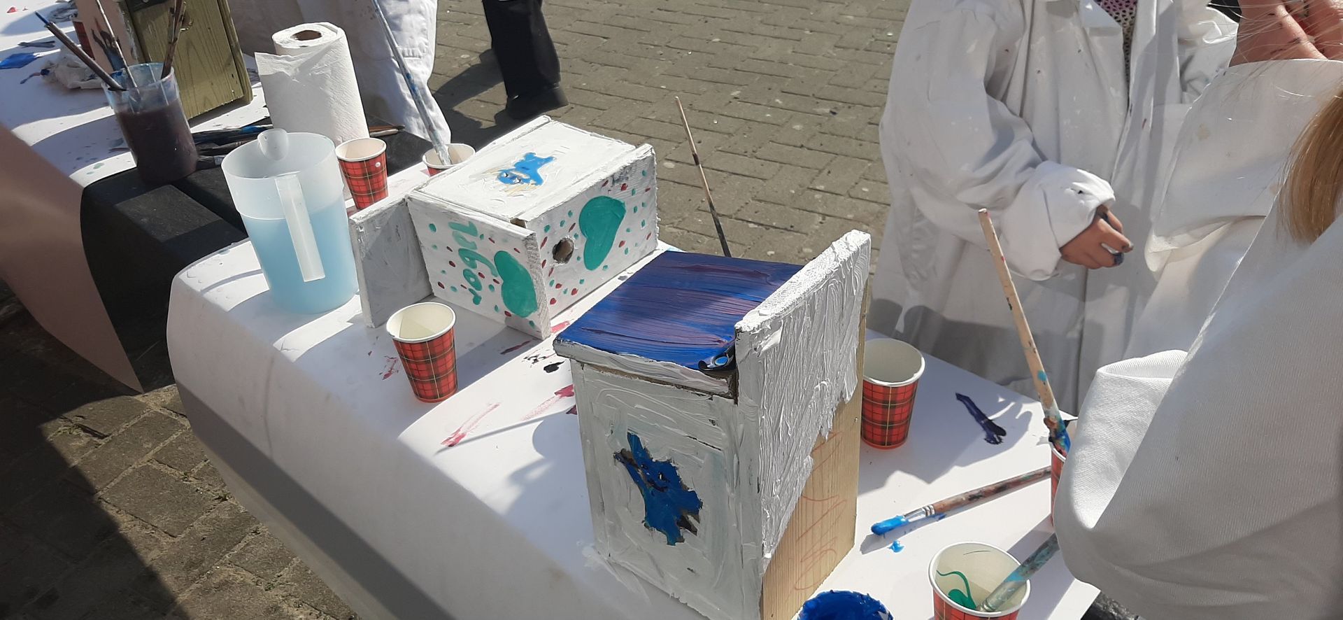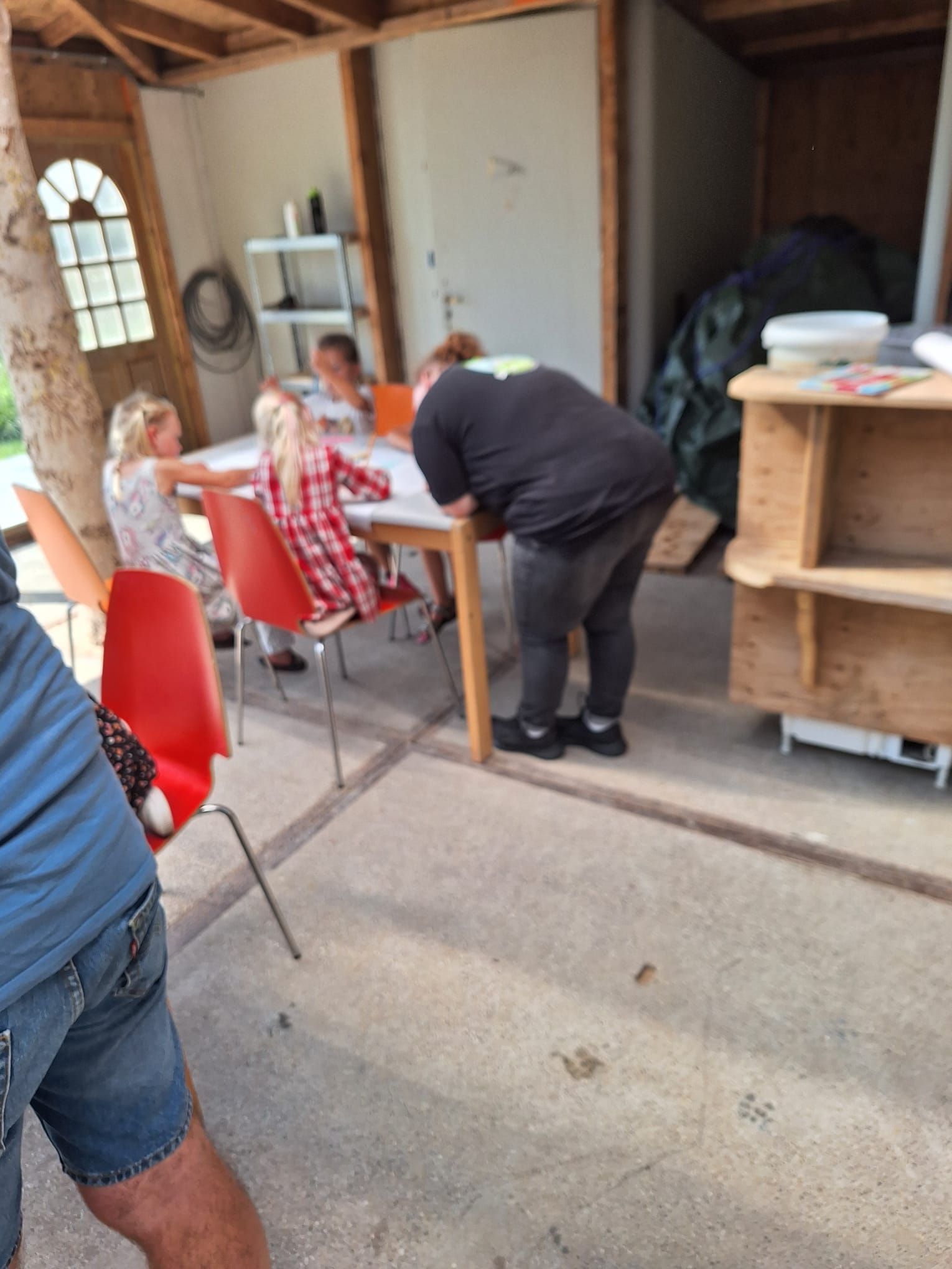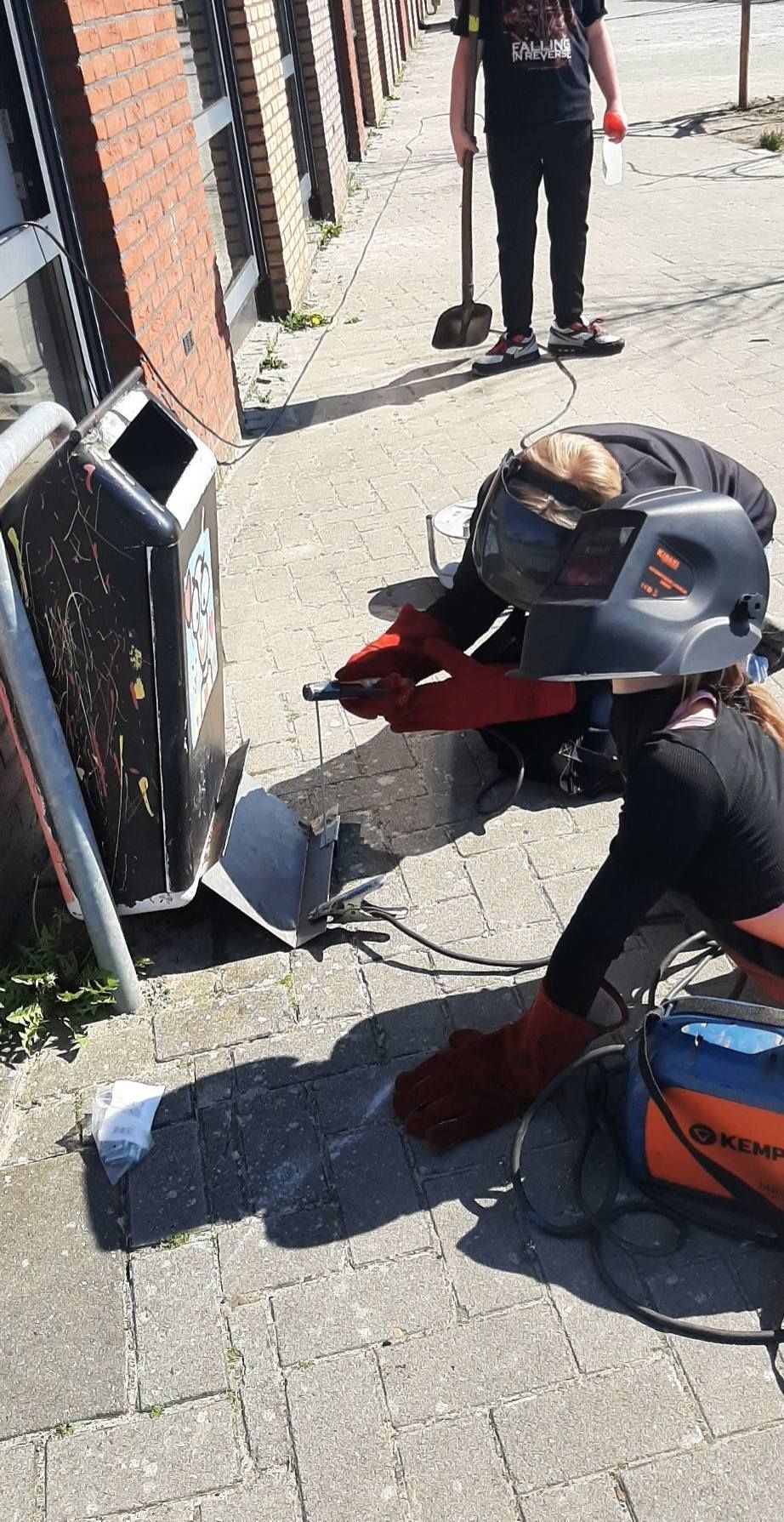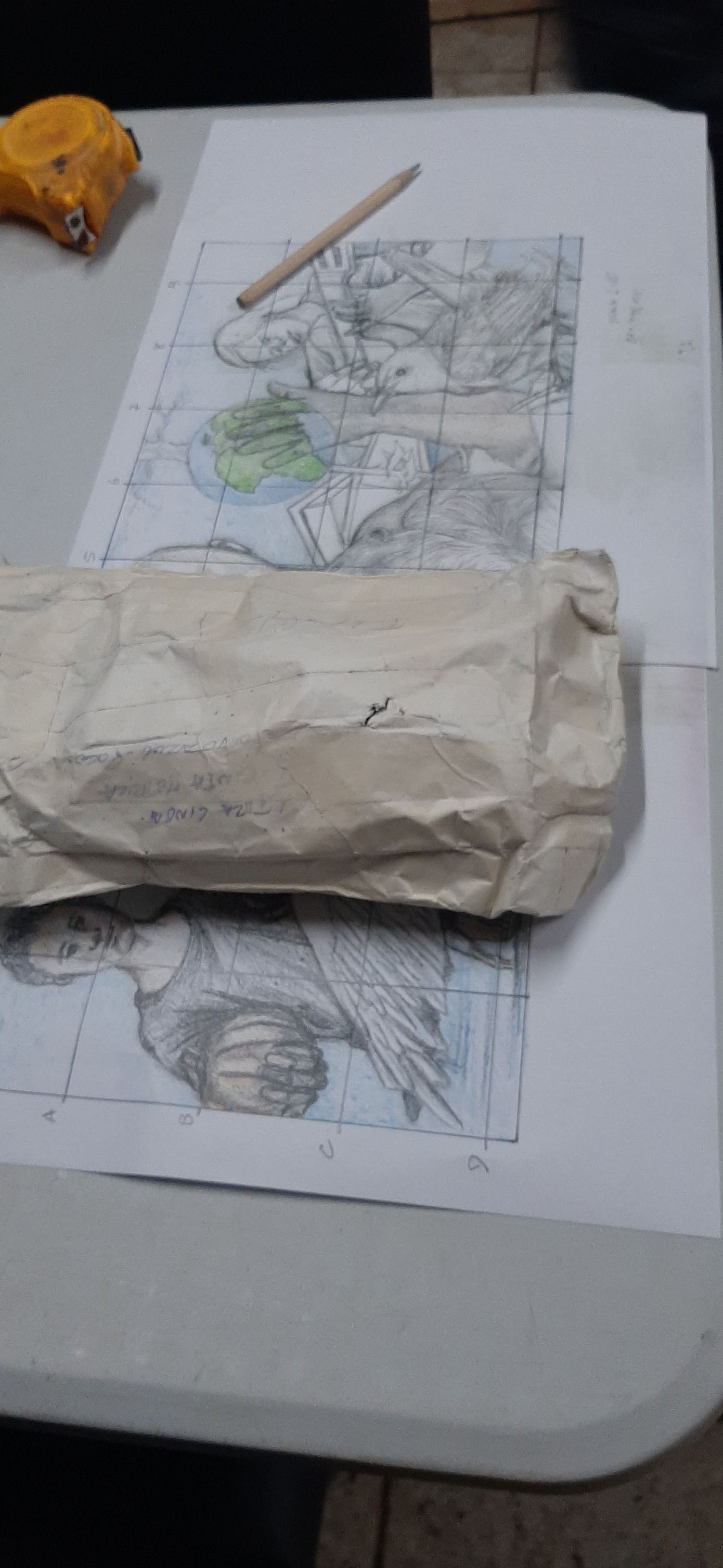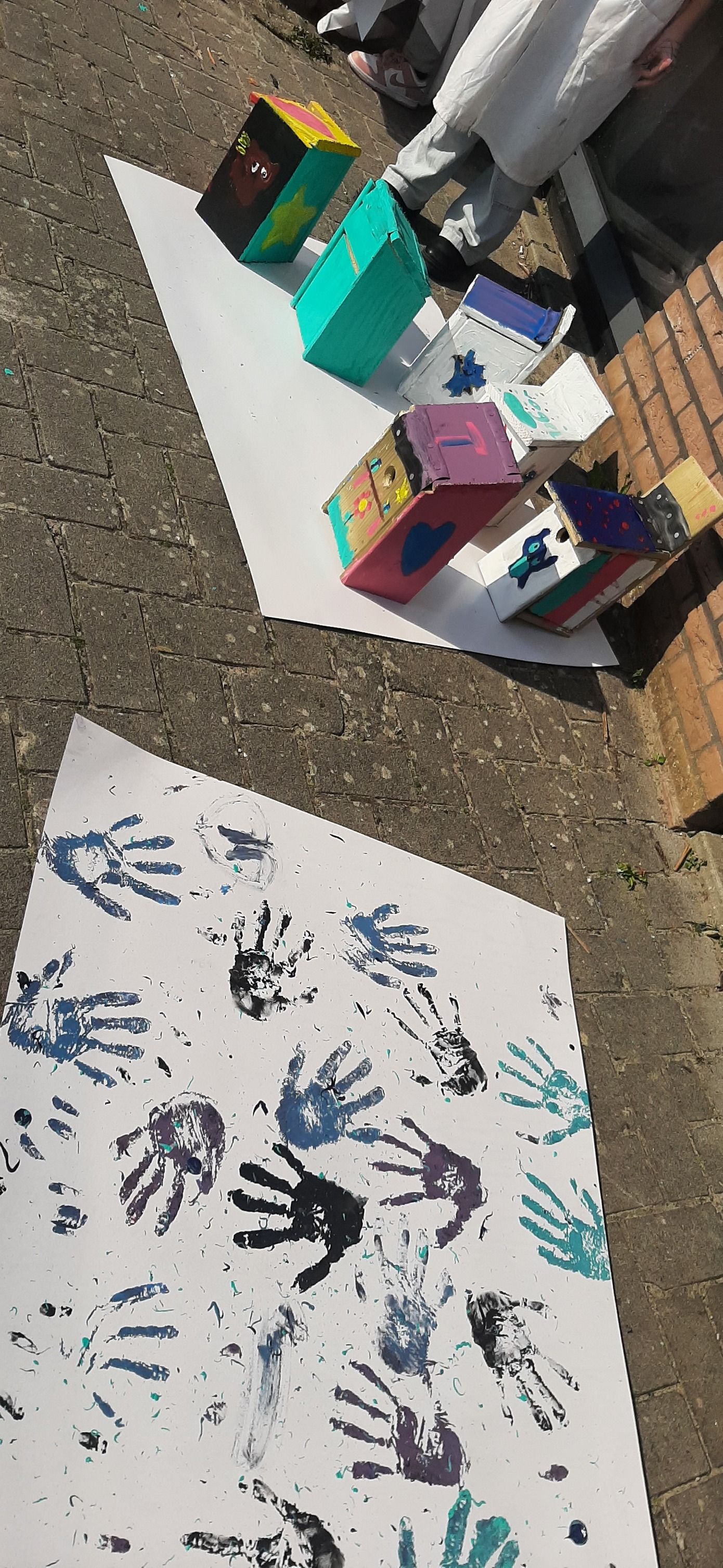 Werkwijze Manuel hij bekijkt alle schetsen welke thema's komen vaak terug wat zijn sterke beelden. Daarmee maakt hij een gezamenlijk kunstwerk. De schets is nu af en morgen plaatst hij het op de panelen. Wij hebben ook een zonnige klusdag gehad.