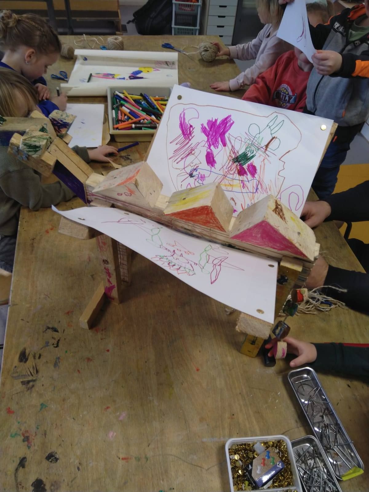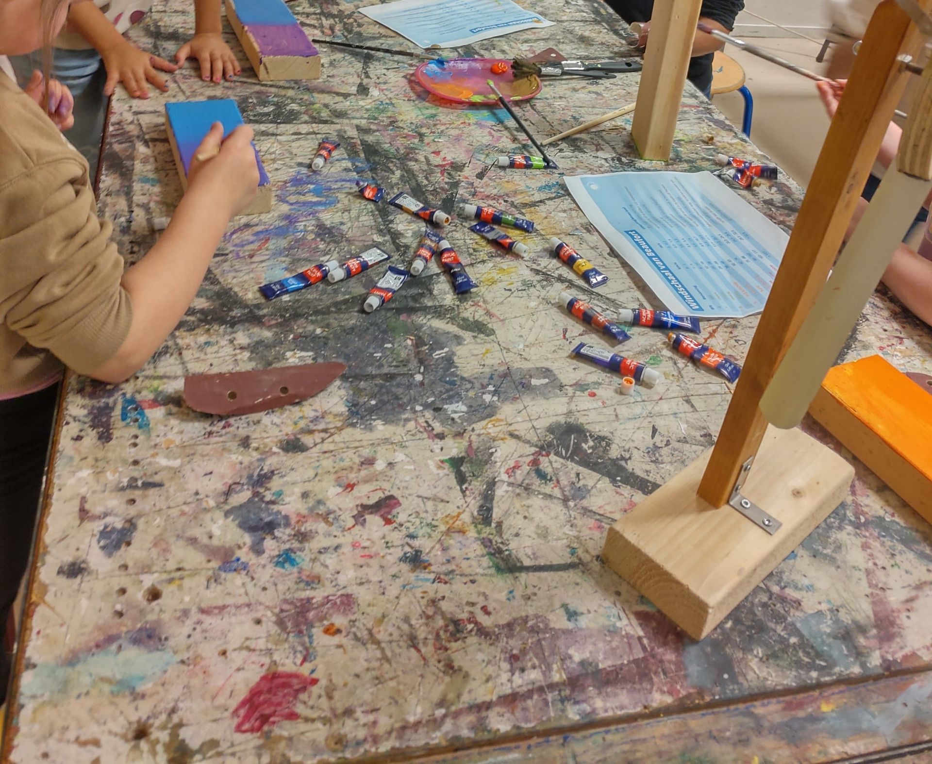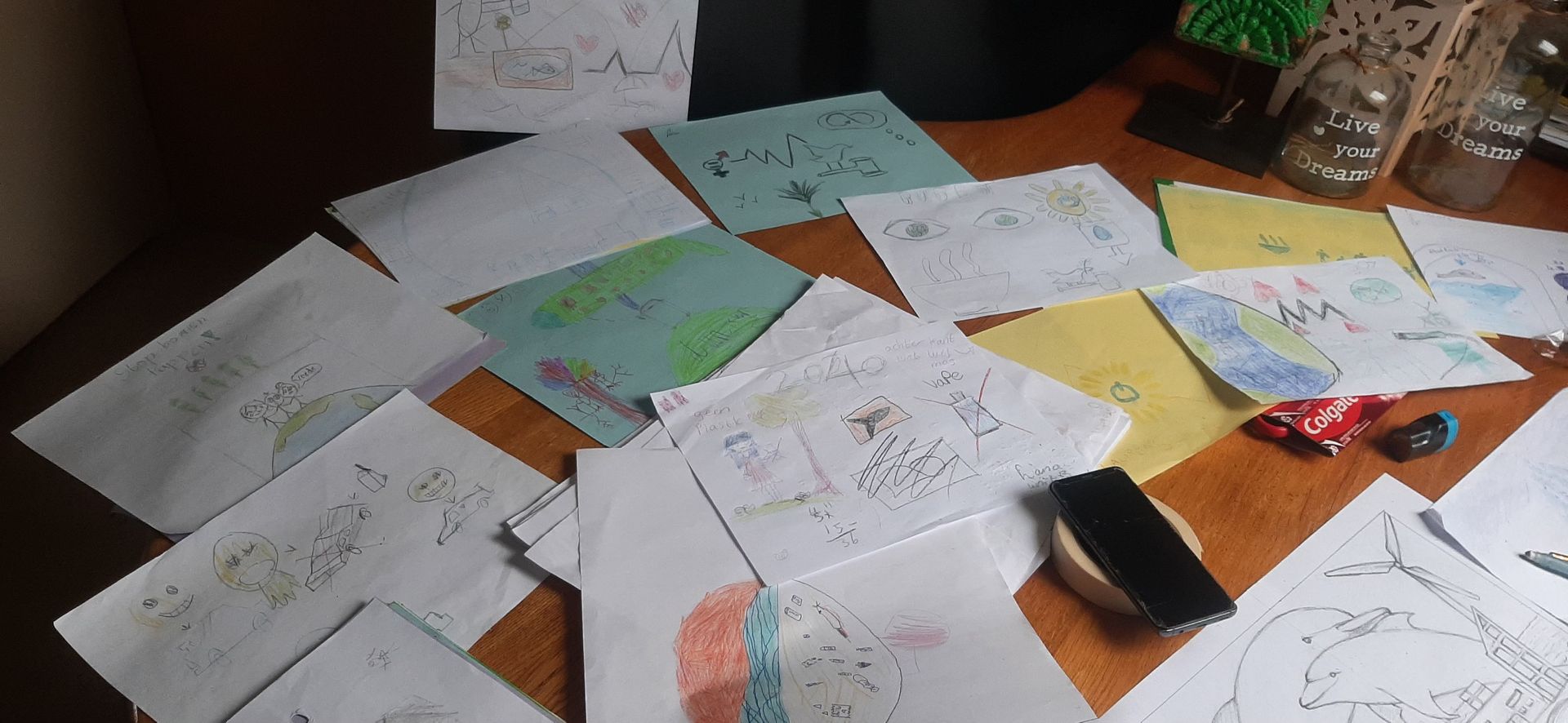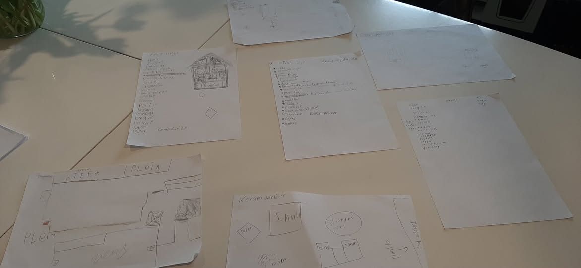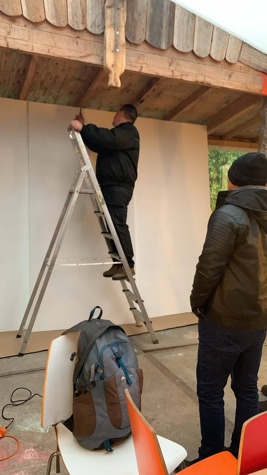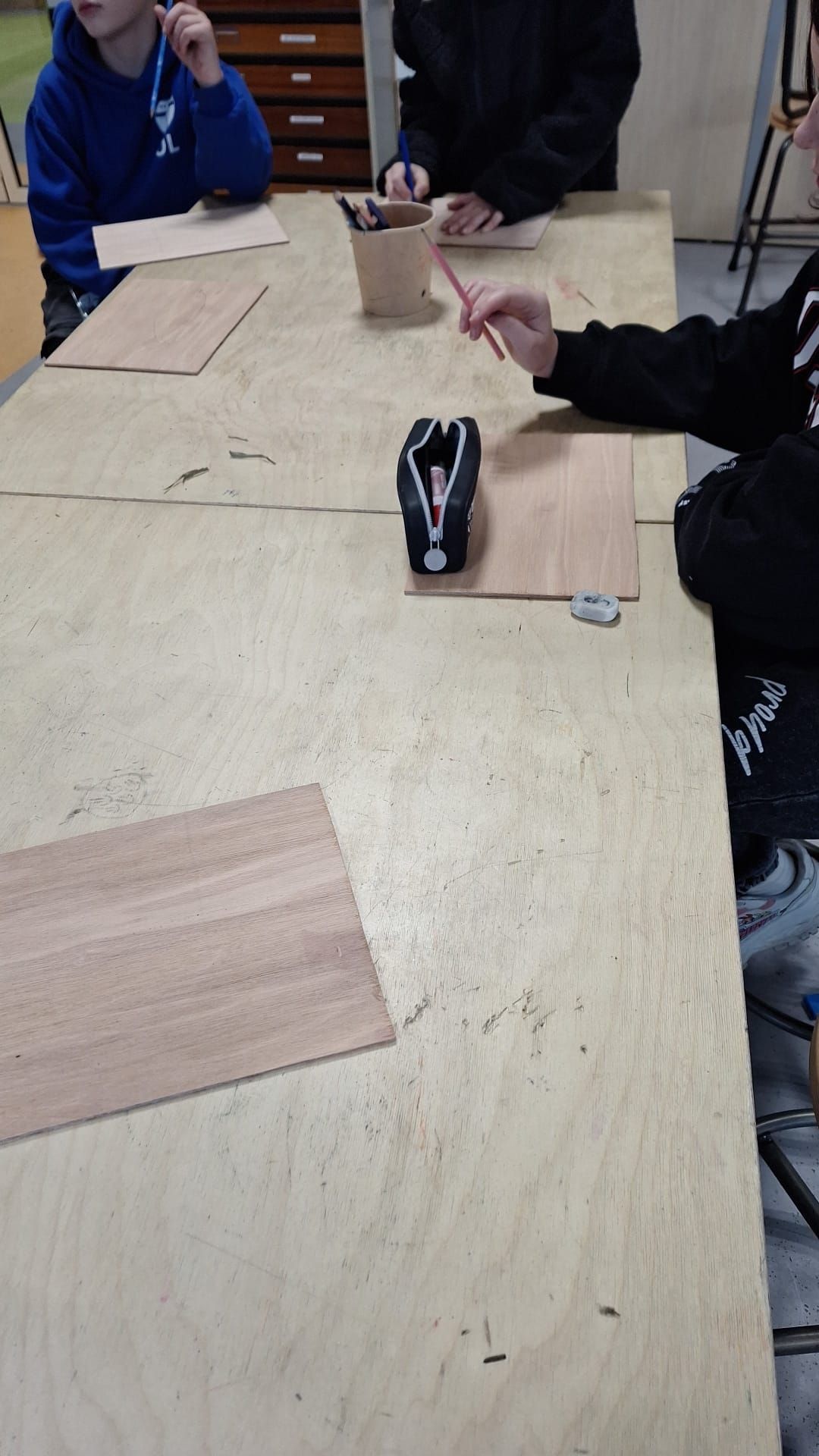 Werkwijze Manuel hij bekijkt alle schetsen welke thema's komen vaak terug wat zijn sterke beelden. Daarmee maakt hij een gezamenlijk kunstwerk. De schets is nu af en morgen plaatst hij het op de panelen. Wij hebben ook een zonnige klusdag gehad.
