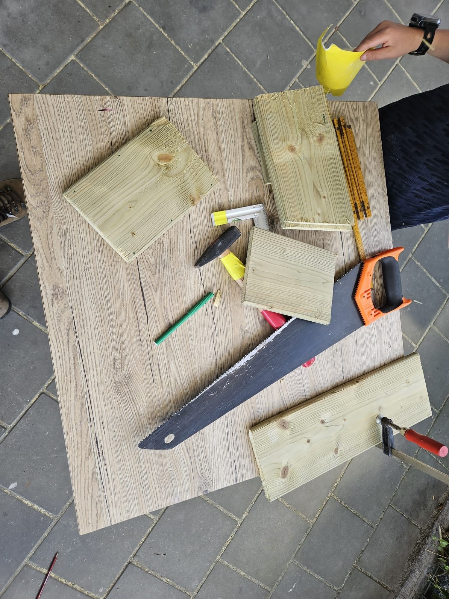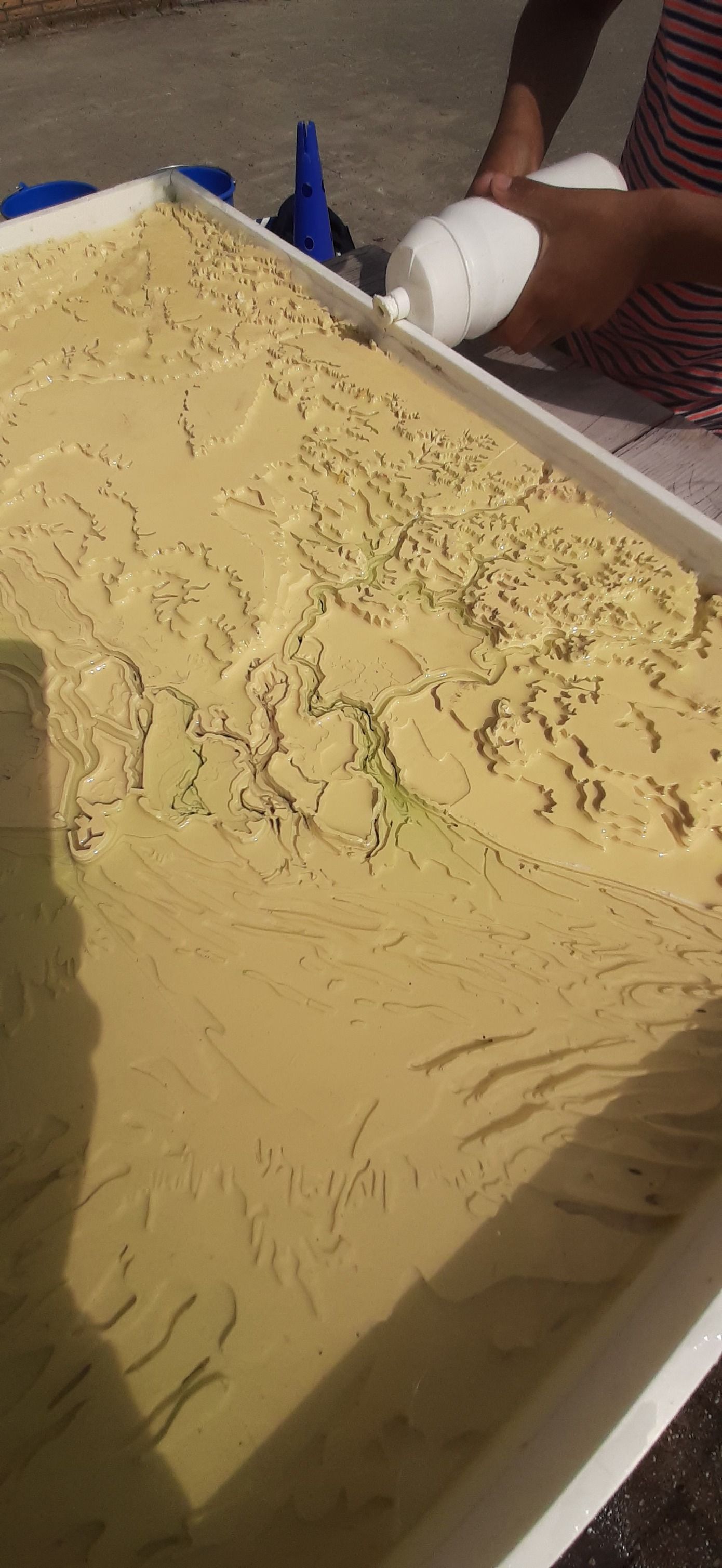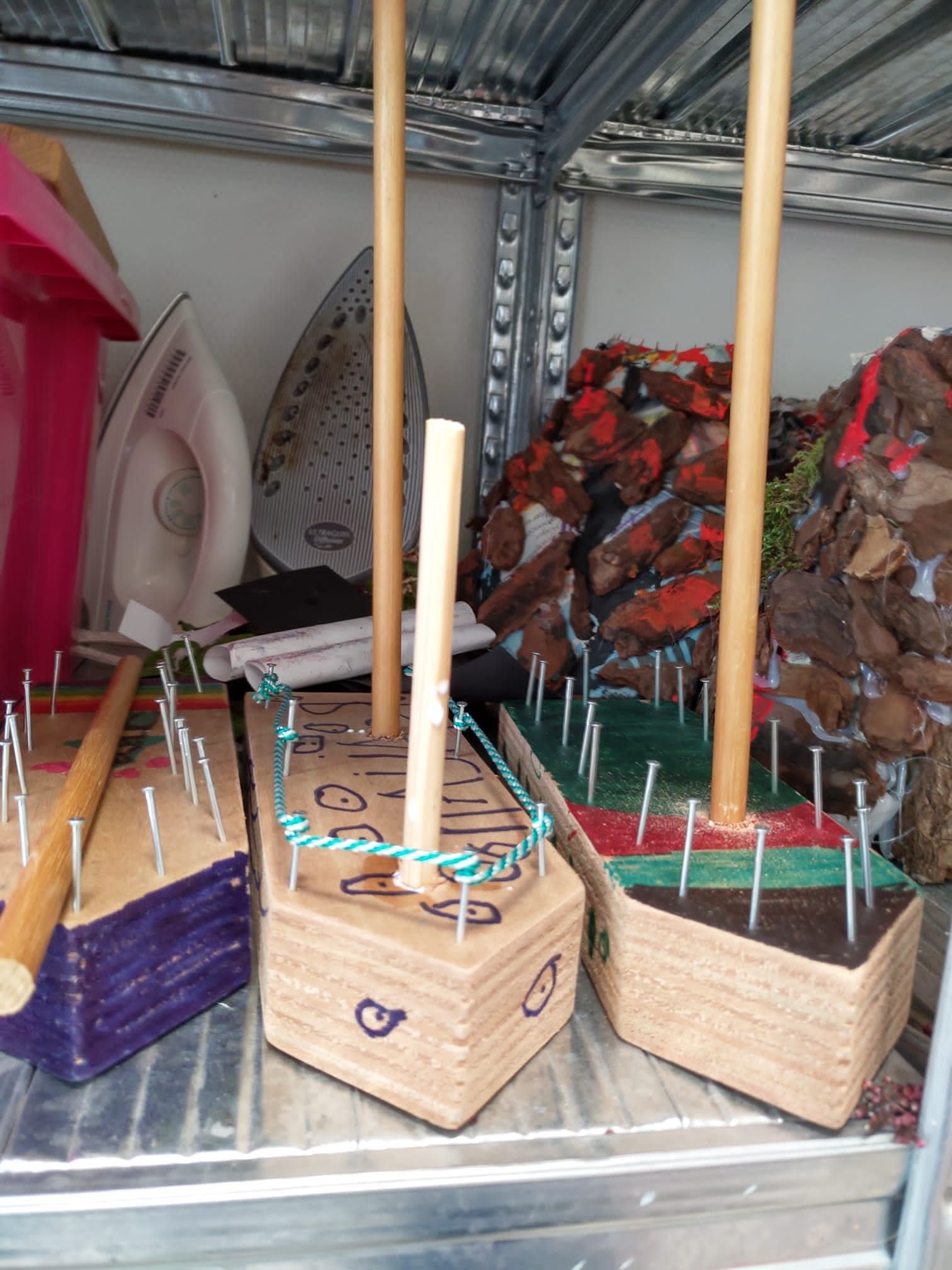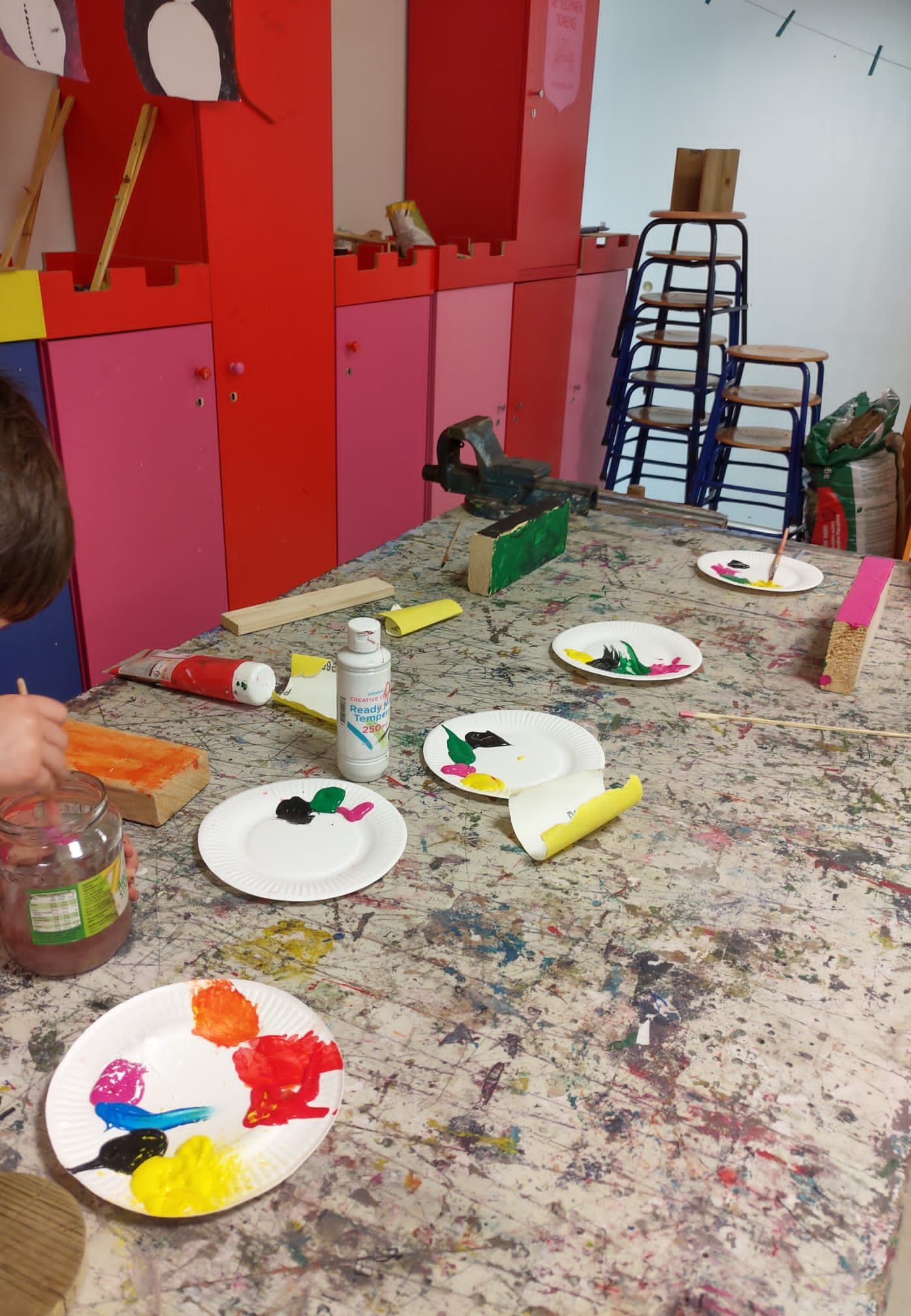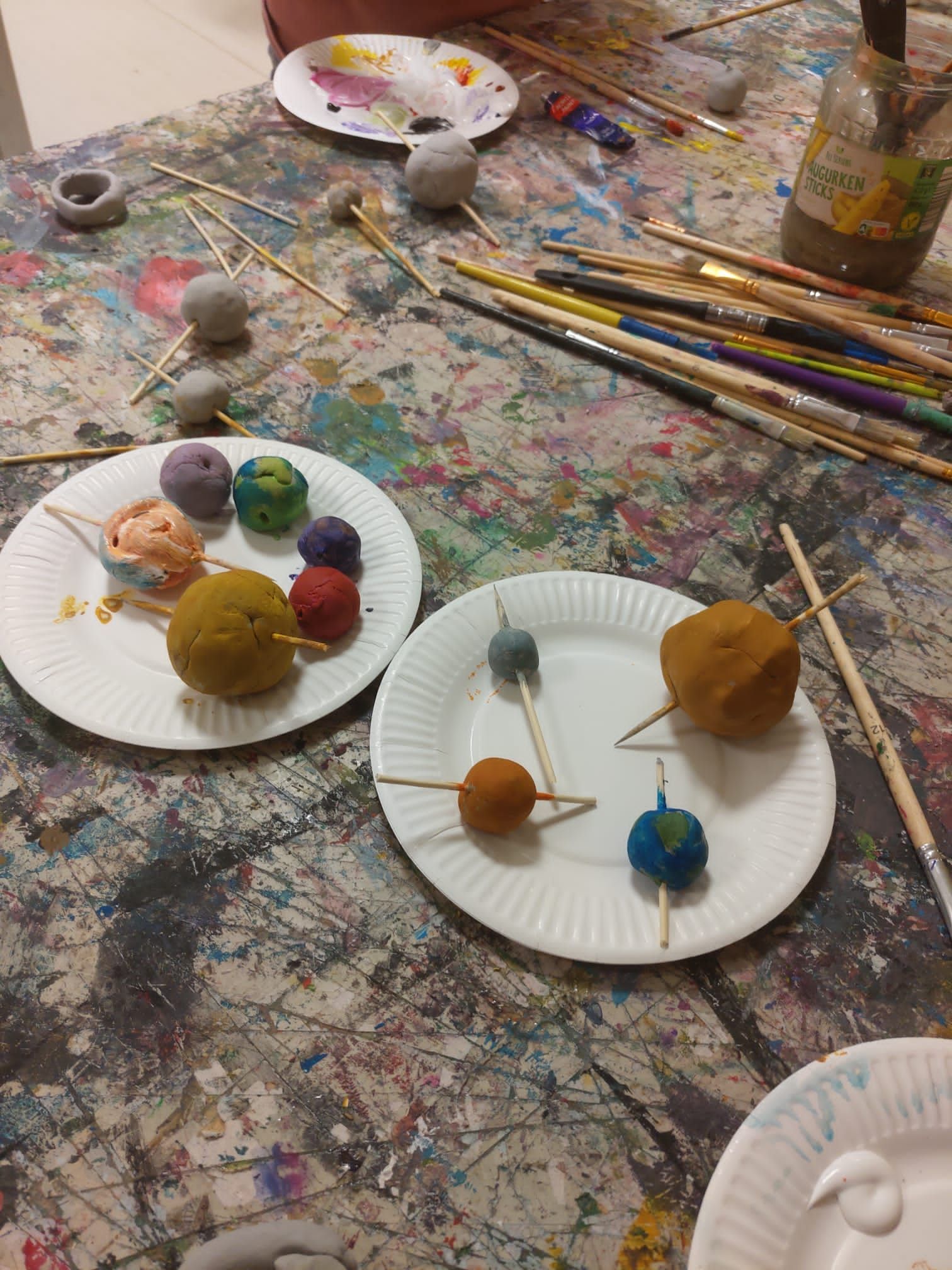 Werkwijze Manuel hij bekijkt alle schetsen welke thema's komen vaak terug wat zijn sterke beelden. Daarmee maakt hij een gezamenlijk kunstwerk. De schets is nu af en morgen plaatst hij het op de panelen. Wij hebben ook een zonnige klusdag gehad.